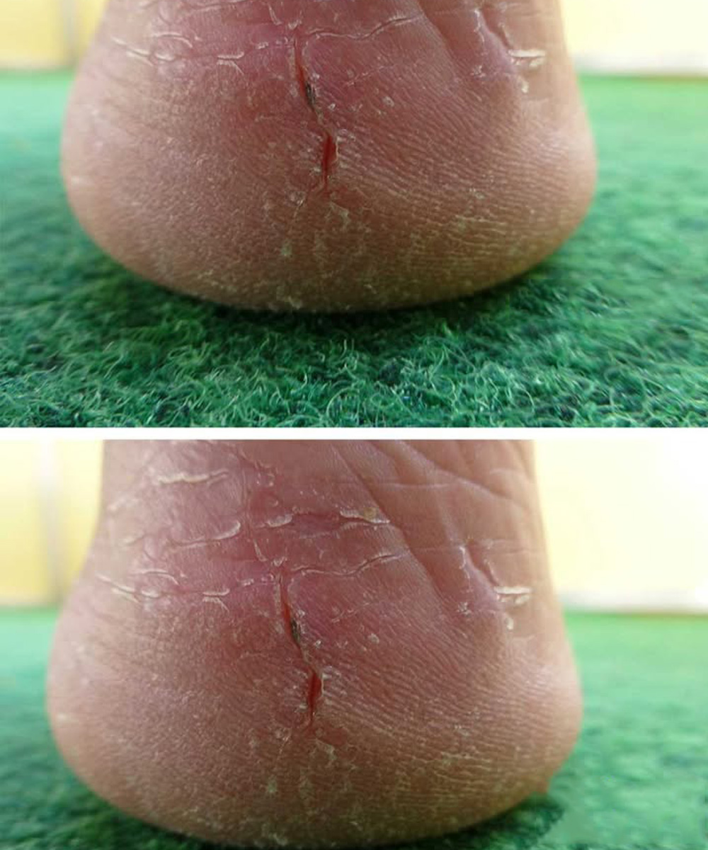 Si tus talones están cubiertos de piel dura y seca, la humedad no se absorbe fácilmente. En estos casos, podrías necesitar cuidados adicionales, como exfoliación, baños de pies o el uso de agentes oclusivos (p. ej., vaselina) para retener la humedad durante la noche.