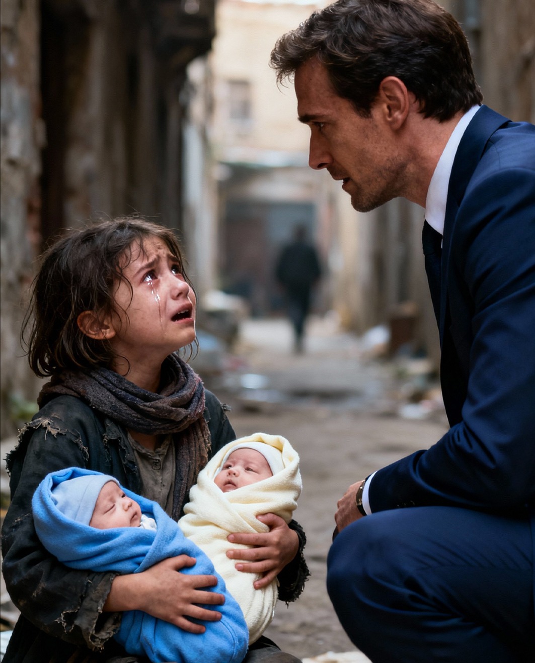 ¿Te quedas con uno? Susurra la niña entre lágrimas. Millonario se queda helado al ver a una niña de la calle cuidando a dos bebés. La llovisna había comenzado otra vez, delgada y helada como agujas en la piel. Daniela apretó los dientes para no tiritar mientras se acurrucaba junto a sus hermanos, cubriéndolos con el pedazo de cobija raída que su madre les dejó antes de morir. La construcción abandonada donde vivían era apenas un esqueleto de concreto, sin paredes completas, sin puertas, sin nada que detuviera el viento.